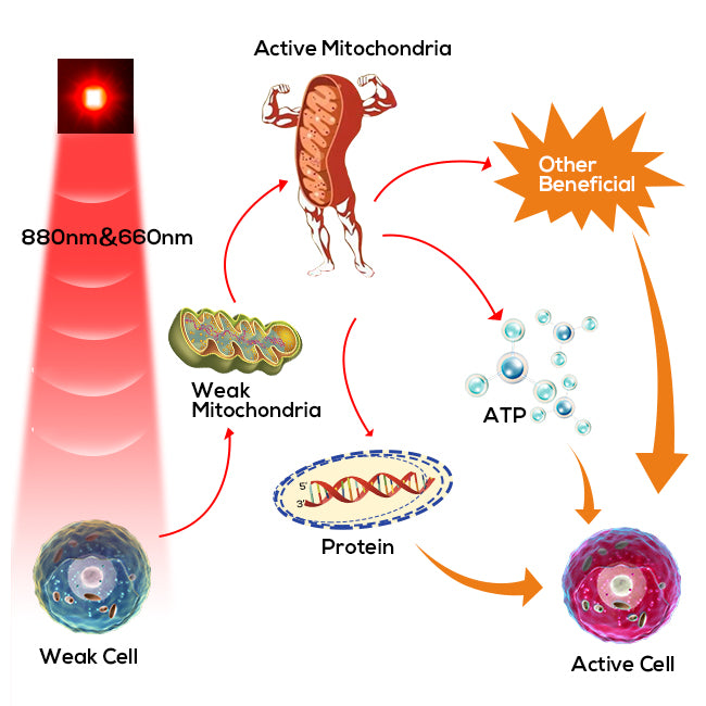 Red Light Therapy acts on the mitochondria to increase the production of ATP.