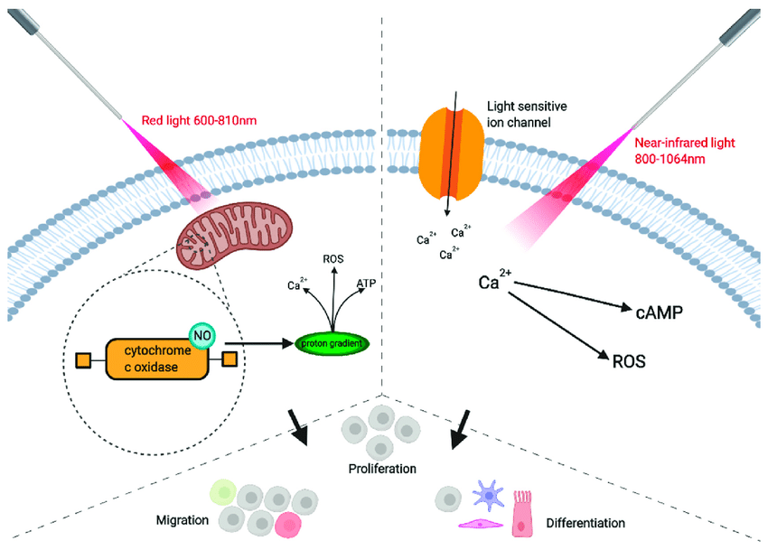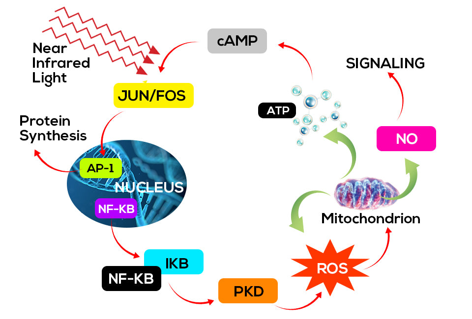 Red & Near-Infrared Light can cause an increase in mitochondrial products such as ATP, NADH, protein. ROS plays an important role in cell signaling, regulation of cell cycle progression, enzyme activation, and nucleic acid and protein synthesis. LLLT promotes the metabolism of oxygen, and acts to increase ROS production. That's how it work for our body.